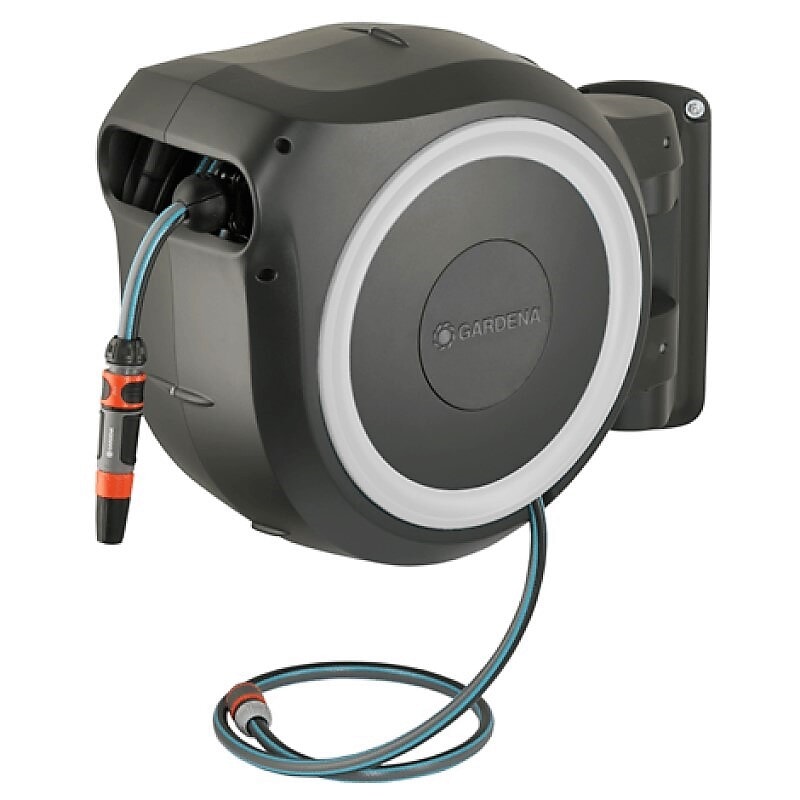 Den veggmonterte slangeboksen RollUp XL gjør vanning av store hager både behagelig og enkelt. Du fester den kompakte slangeboksen permanent på husveggen, og kobler den til kranen med en forbindelsesslange. Med en 35 meter lang slange og en slangeboks som kan dreies 180°, blir vanning av planter en ren fornøyelse. Slangetrommelen følger bevegelsesretningen din og hindrer at slangen bøyer eller vikler seg. Etter at du har trukket ut slangen til ønsket lengde for vanning, vil de ekstra korte låsepunktene slå inn og låse slangen så snart du stopper opp. Når du rykker lett i enden av slangen, frigjør du låsemekanismen og aktiverer den integrerte stålfjæren, som automatisk ruller slangen jevnt tilbake. Den innovative RollControl-teknologien gjør tilbaketrekkingen både trygg og kontrollert. Den integrerte slangeføringen sikrer at slangen rulles opp pent og jevnt, uten floker. Kranen og slangeforbindelsene på slangeboksen er en del av Original GARDENA System, slik at du når som helst kan koble til annet vanningstilbehør fra GARDENA. Munnstykket fra GARDENA er alltid lett tilgjengelig. Det kan festes under veggbraketten og oppbevares der for å spare plass. Materialet av høy kvalitet er UV-bestandig, frostsikkert og beskyttet mot værskader, og kan derfor brukes året rundt. I tillegg beskyttes slangeboksen med en egen tyverisikring. Den veggmonterte slangeboksen RollUp leveres med alle delene du trenger for kobling og montering: en veggbrakett, en forbindelsesslange, alle nødvendige Original GARDENA System- og monteringsdeler og en dyse som lar deg velge mellom to ulike stråler. GARDENA gir 5 års garanti på denne slangeboksen av høy kvalitet. Vanning som alltid er klar til dyst – GARDENAs veggmonterte slangeboks RollUp XL.