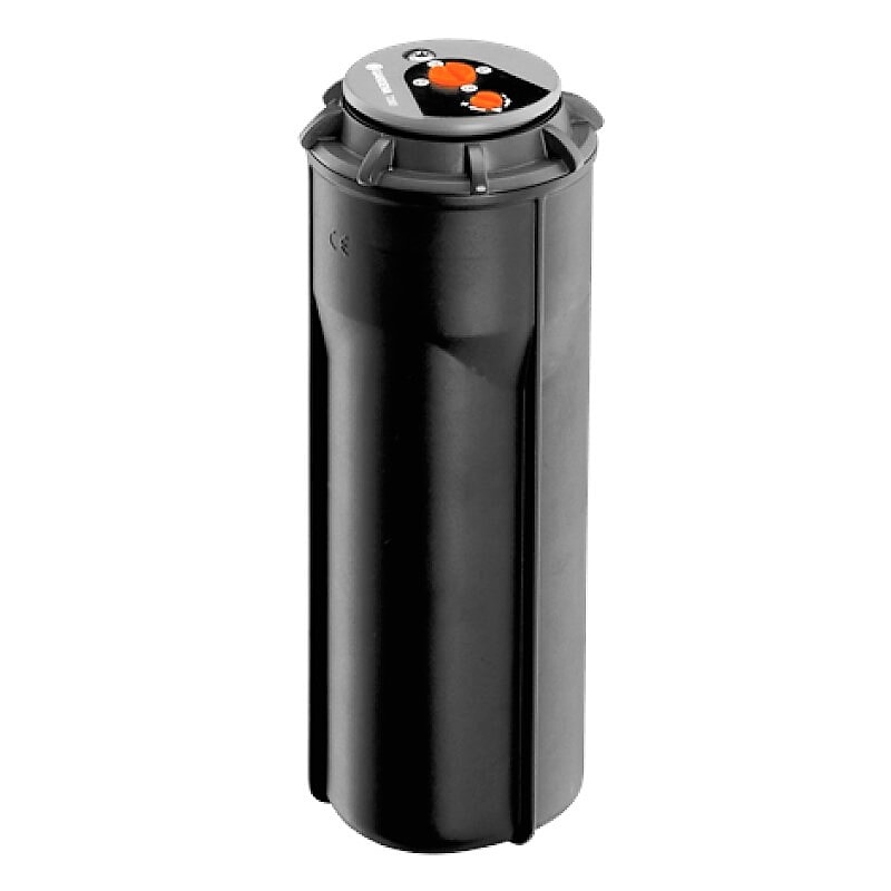 GARDENA Turbodrevet popup-sprinkler T 380 - en del av GARDENA Sprinklersystem - egner seg utmerket for vanning av middels store plener på opptil 380 m². Om nødvendig kan turbodrevet popup-sprinkler T 380 kombineres med turbodrevet popup-sprinkler T 100 og 200 (art. nr. 8201-29 eller 8203-29), og svingbar popup-sprinkler OS 140 (art. nr. 8220). Dekningsområdet er trinnløst regulerbart fra 6 til 11 m for hvert enkelt område. Sektoren som vannes kan reguleres trinnløst - uten verktøy - på sprinklerhodet fra 25 til 360°. Et område fra en svært liten sektor til en fullstendig sirkel kan vannes. Gjennom minnefunksjonen går sprinkleren automatisk tilbake til den forhåndsinnstilte sektoren, selv når sprinklerhodet dreies med vilje. Dette sikrer at riktig område alltid blir vannet. Det finnes fire dyser med forskjellig vannmengde for fleksibel vanning, som kan velges ut fra behovene i hver enkelt vanningssektor. Dette er spesielt viktig for jevn vanning ved kombinert bruk av sprinklere med forskjellig innstilte vanningssektorer. Det integrerte smussfilteret gir uavbrutt drift. Det pålitelige, sandsikre turbodrevet sikrer lang levetid. Ved å installere dreneringsventil (art. nr. 2760-20) i rørlinjen blir sprinklersystemet frostsikkert. Tilkobling med 3/4" hunn-gjenger.