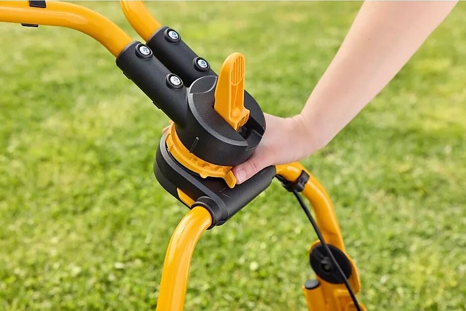 Den er manøvrerbar og designet for å vare, og den fremre støtfangeren på gressklipperen beskytter aggregatet mot støt og skraper. Det er også et øvre håndtak som gjøre det enklere å bære og å løfte den opp for å rengjøre på undersiden. Når du er ferdig for dagen, kan du kun rotere Fulcrum-håndtaket 180° for å enkel oppbevaring av gressklipperen.
