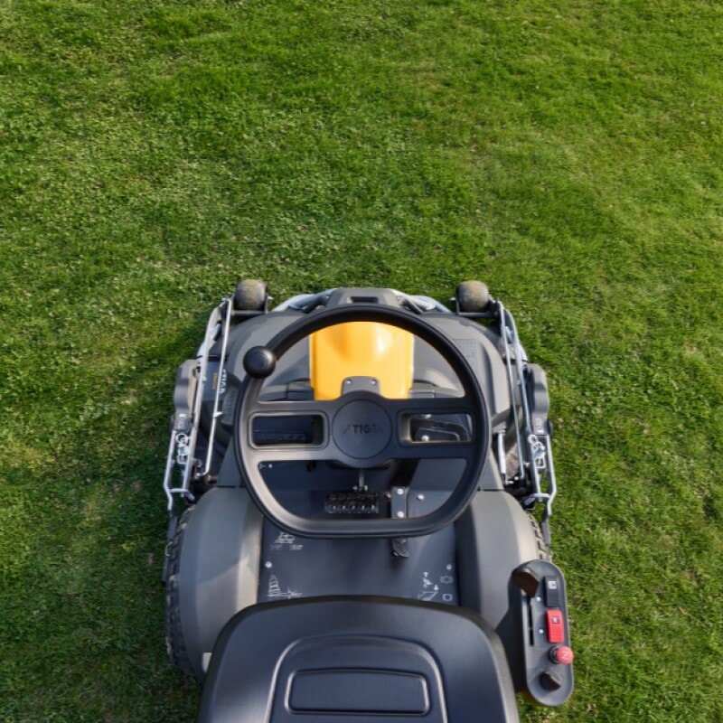 Park 500 drives av en pålitelig STIGA 432 cc 1-sylindret motor, 50:50-leddstyring sikrer at bakhjulene følger i sporene til forhjulene. Det frontmonterte klippeaggregatet gir god oversikt over arbeidsområde, og lettere tilgang til hjørner.