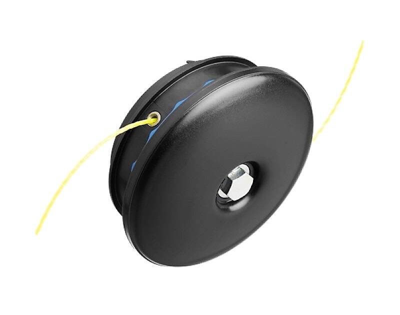 Trimmerhode med manuell trådutmatning. Tråden mates manuelt ut ved å trykke på utmaterknappen og trekke i tråden.