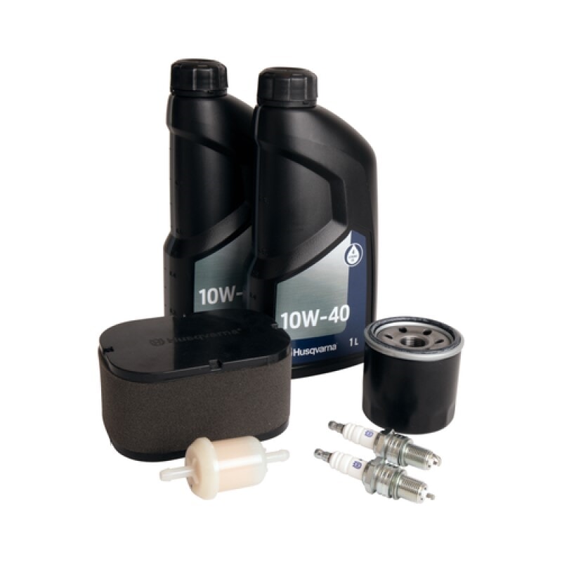 Husqvarna Vedlikeholdssett med luftfilter, drivstoffilter, oljefilter, tennplugg (x2) og motorolje (x2).