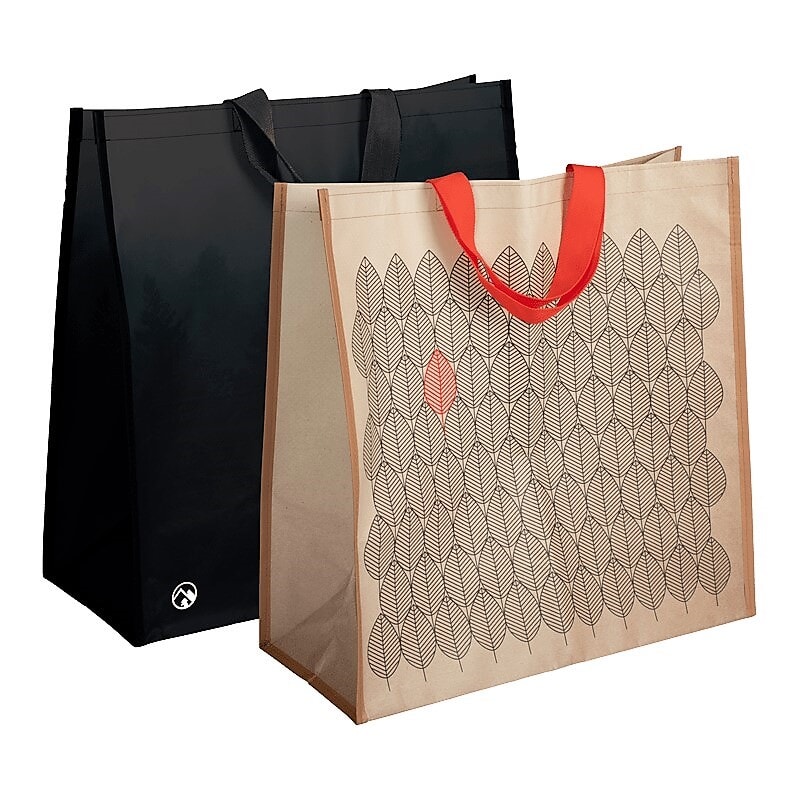 Stilig bag med flust av bruksområder. Kjekk å ha med til butikken, når man skal overraske med gaver eller ellers skal ut på tur. Store nylonhåndtak gjør den god å bære. Bagen har lang levetid som er godt for miljøet. To tidløse motiv – svart med logo og bladmønster.