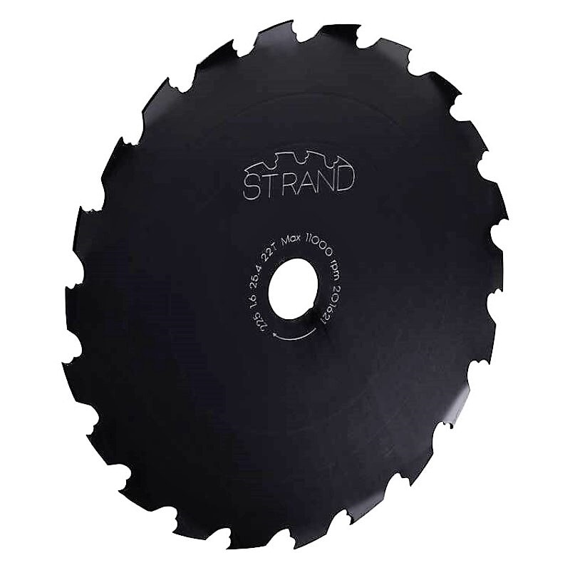 Strand ryddesagblad, et nytt innovativt ryddesagblad med mange fine fordeler. De nye doble tennene gir lavere skjærekrefter og mye raskere felling. Doble tenner reduserer også risikoen for at bladet kiler seg fast ved grovere kutting. Strandbladet er optimalisert for kontinuerlig bruk ved høye hastigheter. Den forblir stabil ved hastigheter opp til 12000 rpm med minimert vibrasjon.